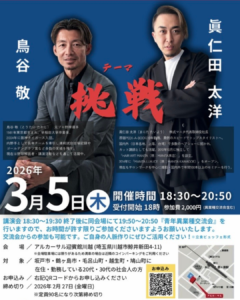 2026 0131 代表 眞仁田太洋講演会 代表眞仁田が3/5(木)に元プロ野球選手の鳥谷敬さんと講演会をいたします。 テーマは【挑戦】新たな価値観を生み出すリーダー育成勉強会となっております。 時間は18:30-19:30 19:50-交流会を行います。 2027年度新卒募集 前の記事
